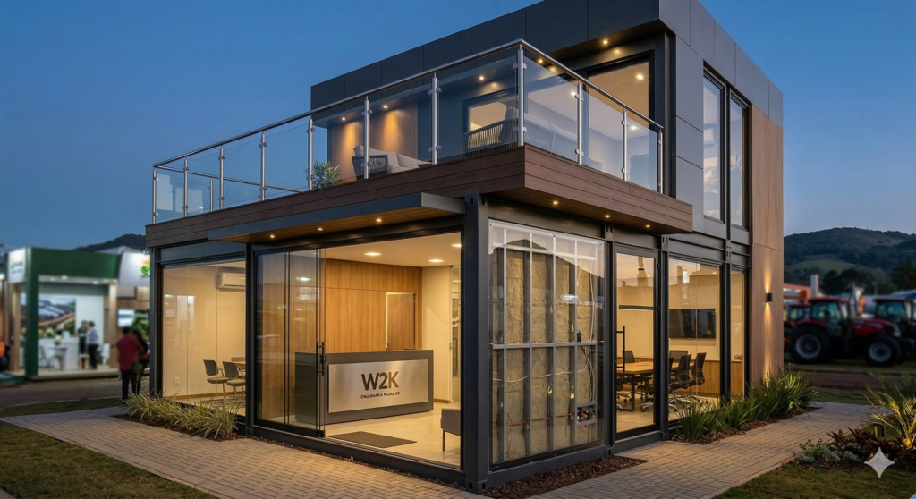Vãos livres imponentes e fachadas que comunicam autoridade. Nossa metodologia de construção a seco permite layouts arrojados em projetos comerciais.